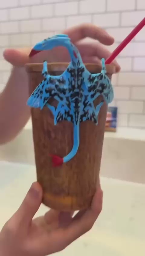 Vaso elaborado en plástico texturizado con tapa, sorbito y personaje en 3D en un lateral. Doble capa interna traslucida con luz led que se enciende en la parte de abajo del vaso. Baterías incluidas.